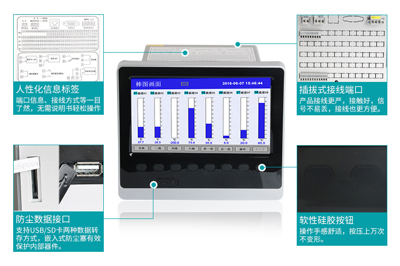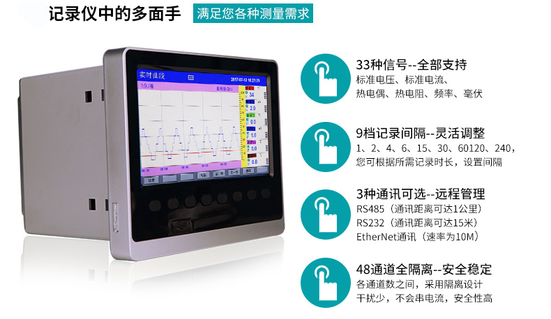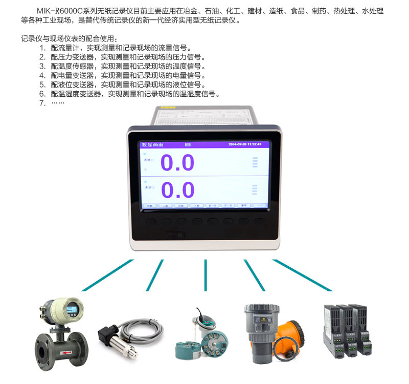 適用場(chǎng)合:米科MIK-R6000C系列彩色無紙記錄儀,可同時(shí)記錄標(biāo)準(zhǔn)電壓、標(biāo)準(zhǔn)電流、熱電偶、熱電阻、頻率、毫伏等信號(hào)??蓭?8路報(bào)警輸出,12路變送輸出,RS232/485通訊接口,以太網(wǎng)接口,微型打印機(jī)接口和USB接口,SD卡插座;