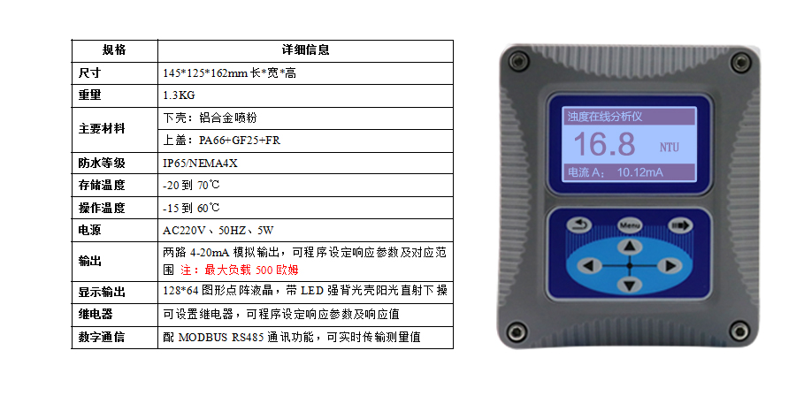 適用場合:濁度在線分析儀具有超低濁度檢出限、高精度測量、設備長時間免維護、省水工作和數字化輸出的特點,可廣泛應用于自來水出廠水、二次供水、管網末梢水、直飲水、膜過濾水、游泳池、地表水等濁度在線監測。